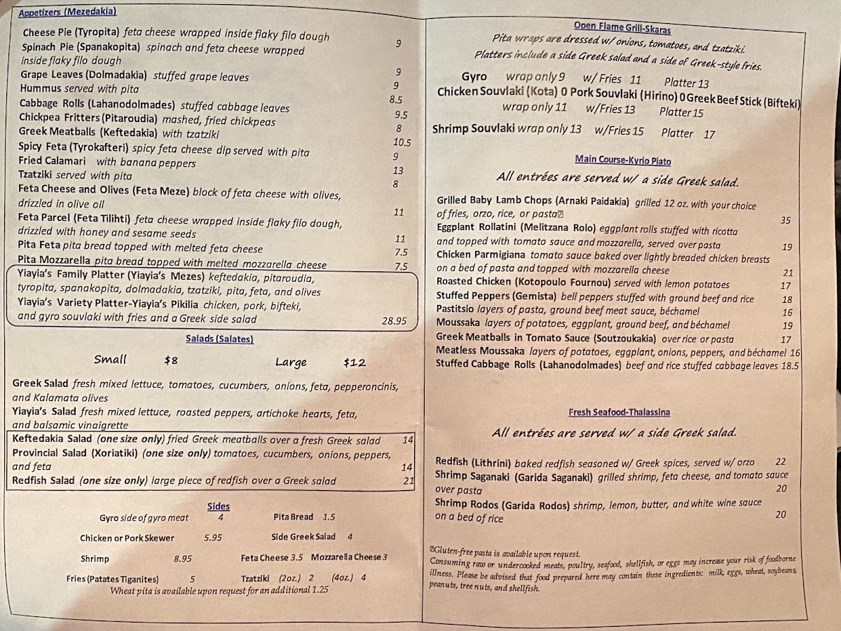 With every dish, you will experience warmth and hospitality, reflected in the friendly service and personal touches from the owners, YiaYia and Papou. Whether you’re here for a quick bite or a family gathering, YiaYia’s delivers an unforgettable culinary journey. Run, don’t walk, to YiaYia's Greek Kitchen!